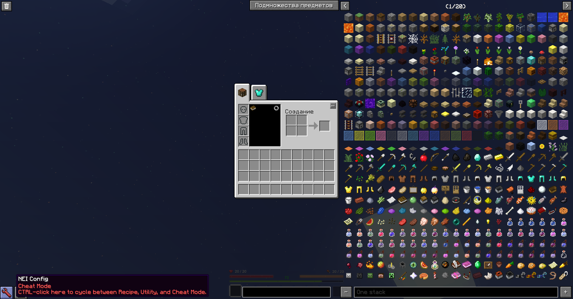 По умолчанию, интерфейс включается и отключается на кнопку "O". Внизу есть строка поиска, для ввода названия предмета. Сверху, во вкладке "Подмножества предметов" вы можете настроить сортировку по модам. В левом нижнем углу есть кнопка, открывающая меню настроек, где вы можете посмотреть текущие назначения клавиш для работы с интерфейсом и отредактировать их.
