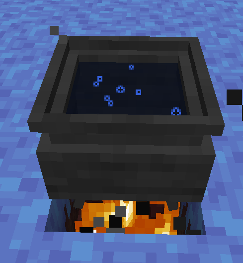При использовании под котлом обязательно должен гореть огонь. Для создания зелий или настоев с помощью котла достаточно кинуть в него определённые предметы в произвольном порядке и кликнуть по нему ПКМ с пузырьком в руке. Для многих крафтов потребляет энергию [**алтаря**](#altar), если энергии недостаточно - вместо ожидаемого результата вы получите пузырёк воды.